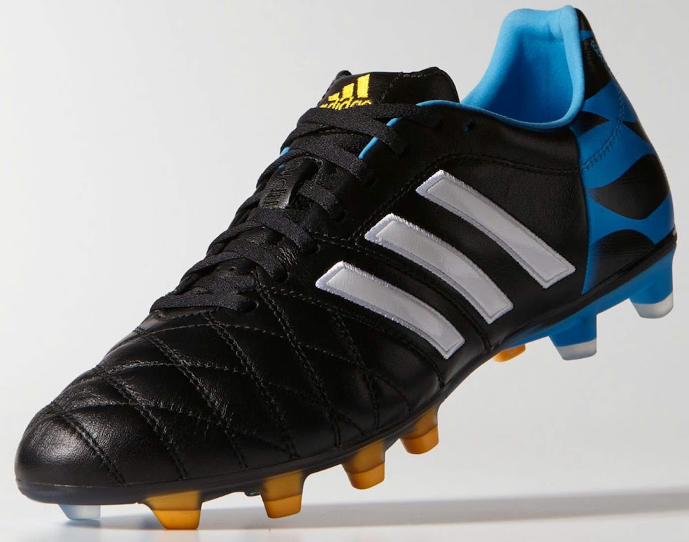 Die schwarze Oberseite des neuen Adidas Adipure 11pro 2014-15 Schuhs weist traditionelle weiße Adidas Streifen auf, während eine auffällige blau / schwarze Grafik auf die Ferse des Schuhs gedruckt wurde.