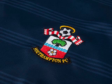 Das neue komplett dunkelblaue Southampton 14-15 Auswärtstrikot weist ein einzigartiges Trikotdesign mit helleren horizontalen Streifen auf der Vorderseite des Trikots auf.