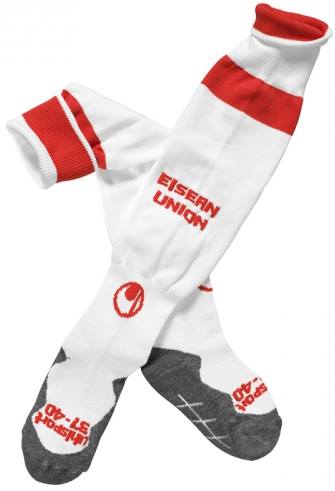 Weiße Hosen und Stutzen komplettieren das neue Union Berlin 2014-2015 Auswärtstrikot.