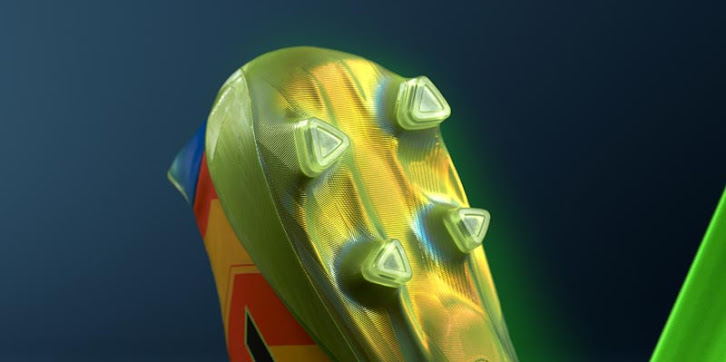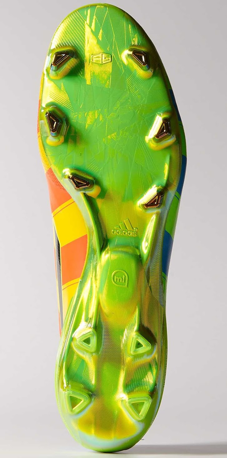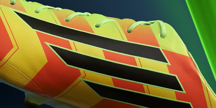 Adidas entwickelte eine komplett neue leichtgewichtige Haut für die Oberseite des Adidas F50 Adizero Crazylight Schuhs, die das Gewicht der Oberseite des Fußballschuhes reduziert. Das grün / orange / blaue Pfeil Design zeigt den Idealzustand der Vorwärtsbewegung, kombiniert mit schwarzen drei Streifen.