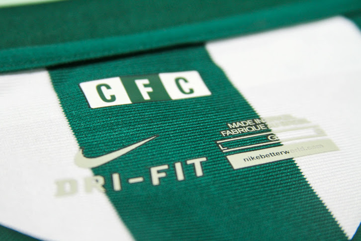 Das neue Coritiba 2014-2015 Trikot weist einen modernen V-Kragen auf. Innerhalb des Kragens befinden sich die Initialien des Klubs "CFC" im selben Design wie auf den nummerierten Sitzen des Stadions.