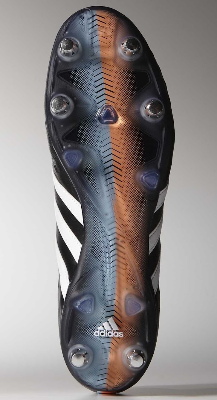 Ein auffälliges Designelement des neuen Adidas Adipure 11pro Schuhs ist die orange / blaue Linie, die von der schwarzen Oberseite bis zur Ferse des Fußballschuhes verläuft, während die Linie auch auf der Außensohle fortgeführt wird.
