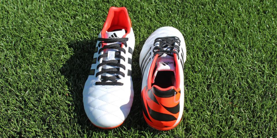 Für den Adidas Adipure 11pro Fußballschuh, hat Adidas einen überwiegend weißen Schuh mit einer orange / schwarzen Außensohle entworfen.