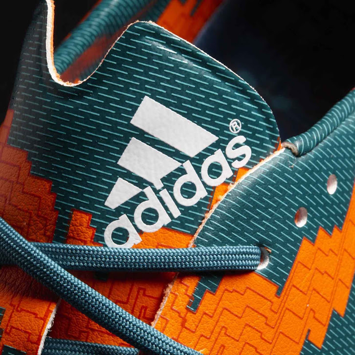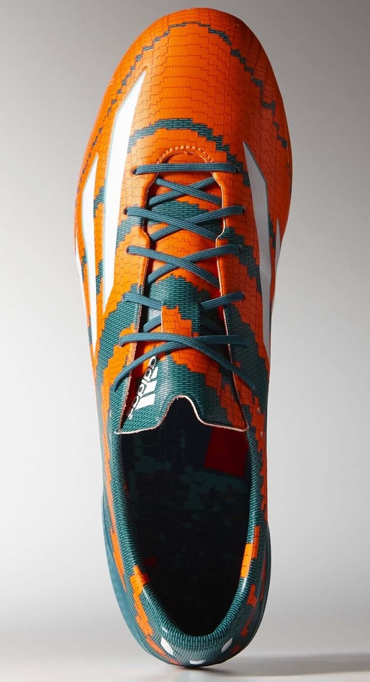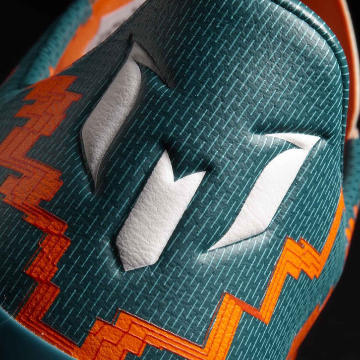 Der Dunkeltürkis (Grün) / Orange Adidas Leo Messi 2015 Fußballschuh wird offiziell Adidas Messi mirosario genannt, basierend auf der jetzigen Generation des Adidas Adizero IV Schuhs. Für die Oberseite verwendet Adidas das dünne Hybridtouch 2.0 Material, das die Vorteile von Leder und synthetischen Materialien kombiniert, während der Fußballschuh ohne das leichtgewichtige Speedfoil Material kommt.