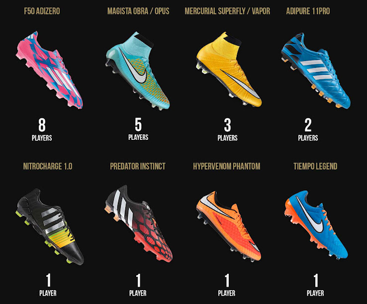 Der Adidas Adipure 11pro wird von Phillip Lahm und Toni Kroos getragen, während der Adidas Nitrocharge (Manuel Neuer), Adidas Predator (Angel di María), Nike Hypervenom (Neymar), Nike Tiempo Legend (Sergio Ramos) und der Puma evoPOWER (Yaya Toure) jeweils nur von einem Spieler getragen werden.