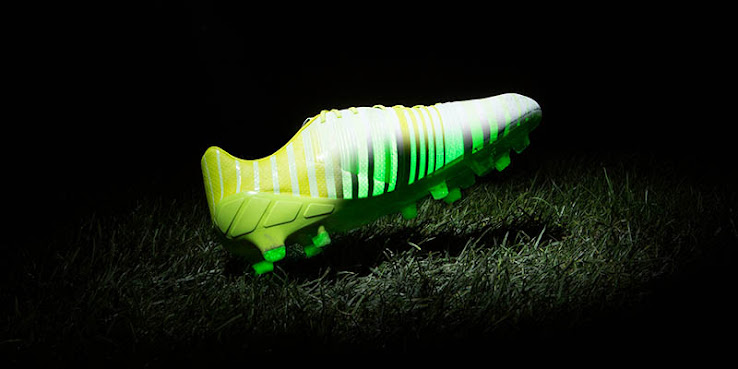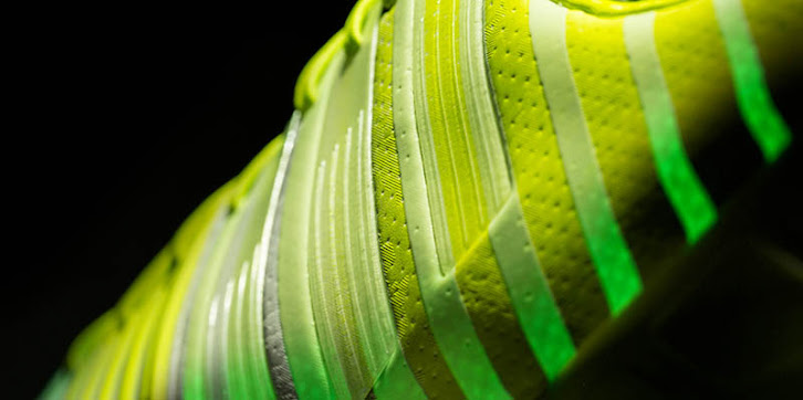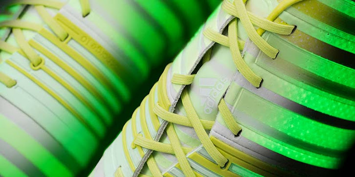 Adidas hat mit grünen Linien auf der Oberseite des Fußballschuhes einen verblassenden Effekt hinzugefügt. Der Bereich zwischen den grünen Linien leuchtet im Dunkeln, wodurch ein einzigartiges Design entstanden ist. Das auffällige Energysling Element wurde entworfen, um Energie zurückzuführen und schlingt sich um den Vorderfußbereich des Schuhs.