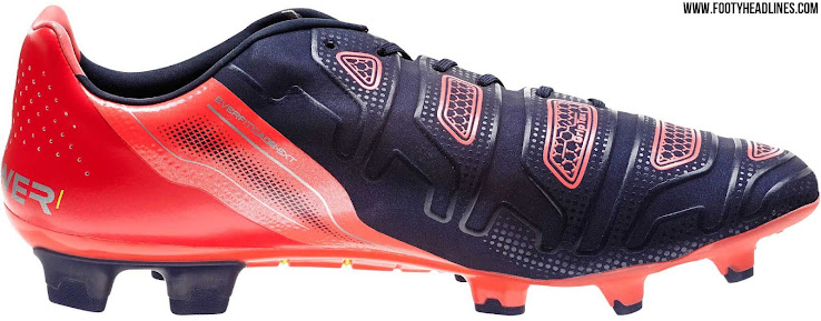Um eine bessere Ballkontrolle bei allen Wetterbedingungen zu bieten, fügte Puma einen transparenten 3D GripTex Druck auf der Oberseite des neuen Puma evoPOWER 1.2 2015 Schuhs hinzu, der bereits für den Puma evoSPEED 1.3 Fußballschuh verwendet wird. Auf der Innenseite des neuen dunkelblauen Puma evoPOWER Schuhes ist der externe EverFit Cage für mehr Stabilität.