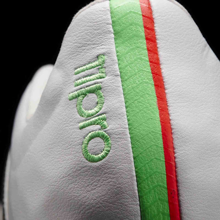 Der weiße Adidas Adipure 11pro 2015 Frauen Schuh weist silberne 3 Streifen und den grünen Schriftzug 11pro auf der Ferse auf. Das markante Element des Next-Gen Adidas Adipure 2015 Fußballschuhs ist ein Grün / Roter Streifen, der von der Ferse bis zum Vorderfußbereich des Schuhes verläuft, während die Linie sogar auf der Außensohle fortgeführt wird.