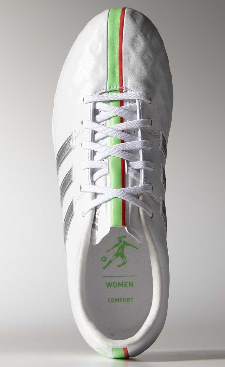 Der Weiß / Silber / Grüne Adidas Adipure Frauen-Fußballschuh ist Dezember 2014 bei ausgewählten Händlern erhältlich.