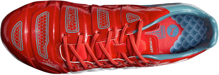 Die türkise Außensohle des neuen roten Puma evoPOWER 1.2 Grafik Fußballschuhs ist die selbe wie die der ersten Generation des Puma evoPOWER.