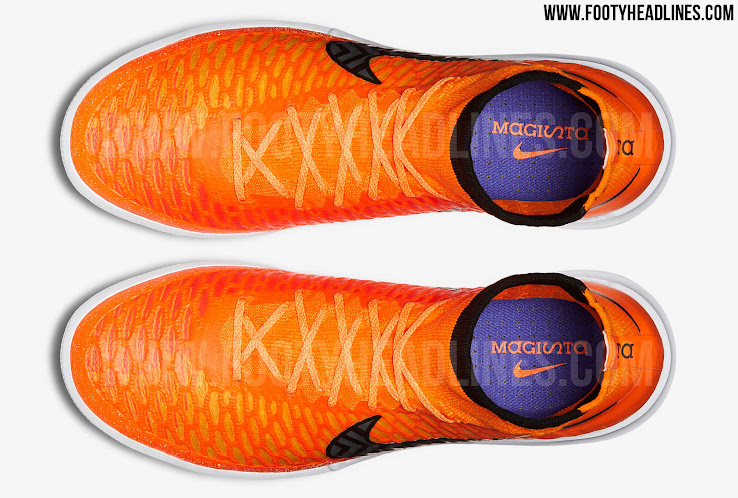 Die selben Farben wie die neuen orangen Nike Magista Obra Sommer 2015 Fußballschuhe aufweisend, kommt der orange Nike Magista X Schuh mit einer auffälligen gelb / roten Honigwabenstruktur und einem schwarzem Swoosh. Die nicht abfärbende Außensohle der neuen Nike Magista Proximo 2015 Hallen und Turf Fußballschuhe ist weiß.
