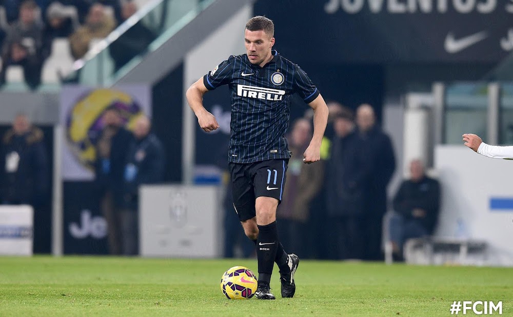 Podolski mit dem Nike Inter 2014-2015 Heimtrikot und dem K-Leder Adidas F50 Adizero.