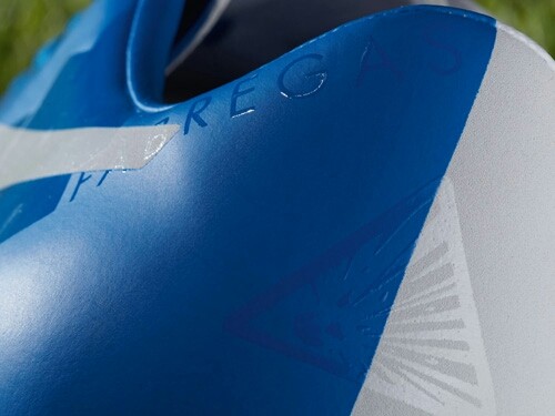 Basierend auf dem gleichen Grunddesign wie schon der Mario Balotelli Signatur-Fußballschuh, kommt der neue blau-weiße Cesc Fabregas Fußballschuh mit gelben Stollen und einem neuen Cesc Fabregas C4 Logo.
