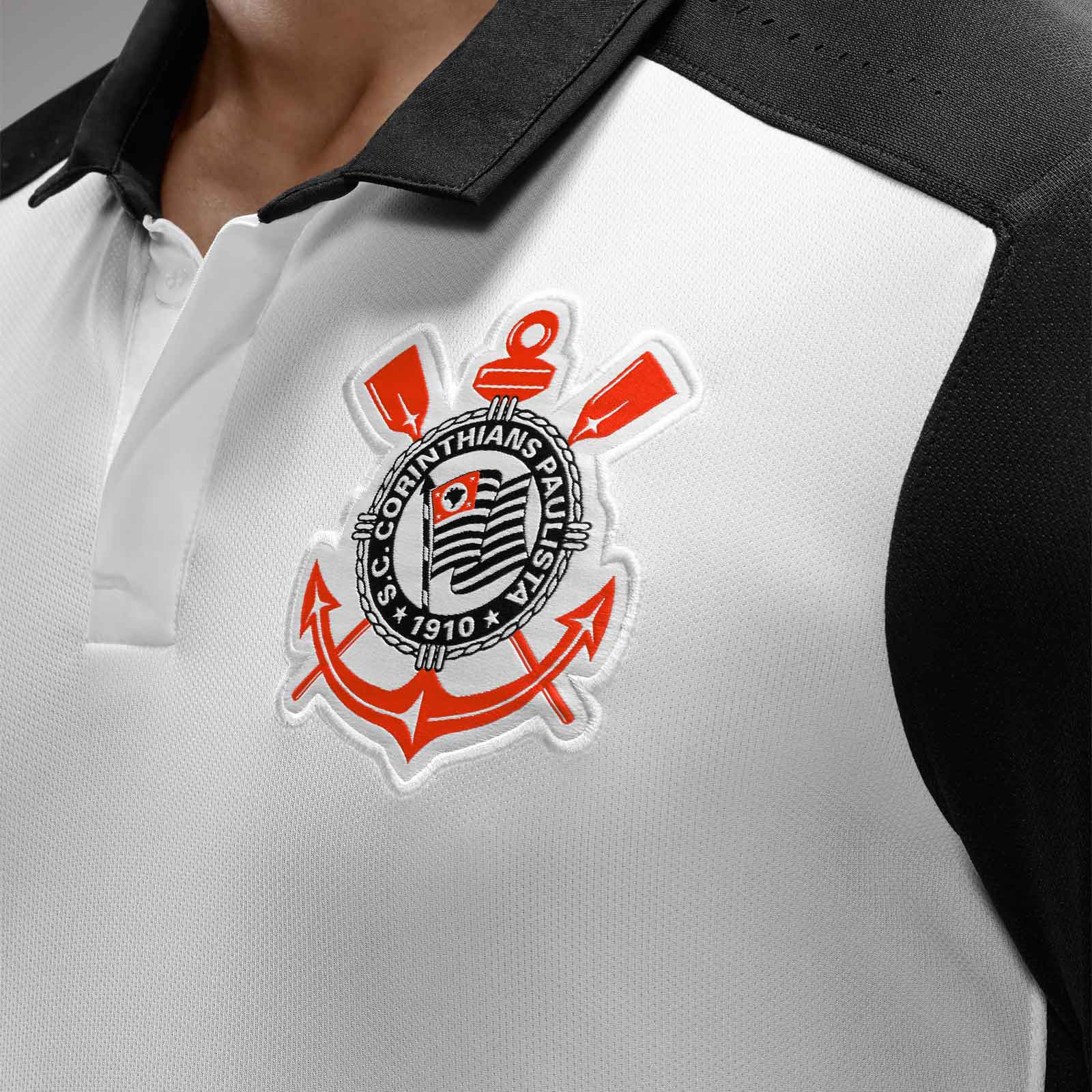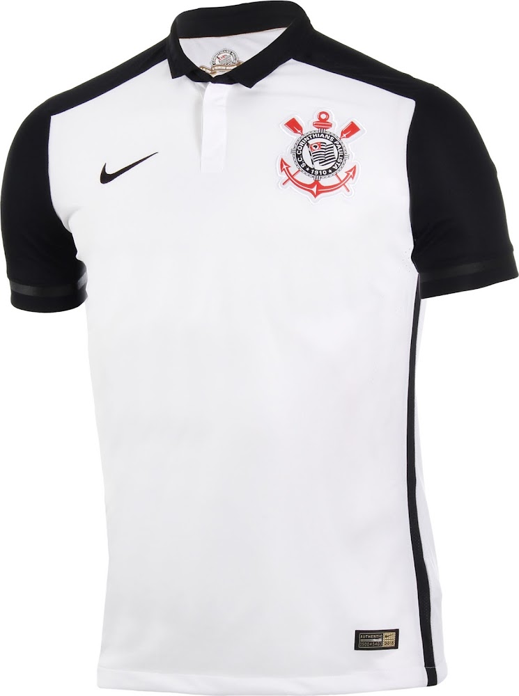 Das neue Corinthians 2015-2016 Trikot von Nike ist hauptsächlich weiß, aber kommt mit schwarzen Elementen als Akzenten. Die schwarzen Streifen auf dem letztjährigen Corinthians Heimtrikot wurden nicht verwendet.