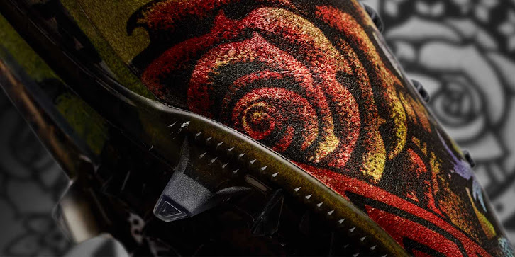 "Der linke und rechte Schuh weisen unterschiedliche Motive auf, die die Themen "Liebe" und "Hass" verkörpern. Der rechte Schuh weist einen bedrohlichen schwarzen Totenkopf als Motiv auf, um Stärke, Kraft und Hass zu betonen. Der linke Schuh wurde mit hellen Farben und verschiedenen Designs entworfen, einschließlich einer Rose, die die Liebe eines Spielers zum Spiel symbolisiert."