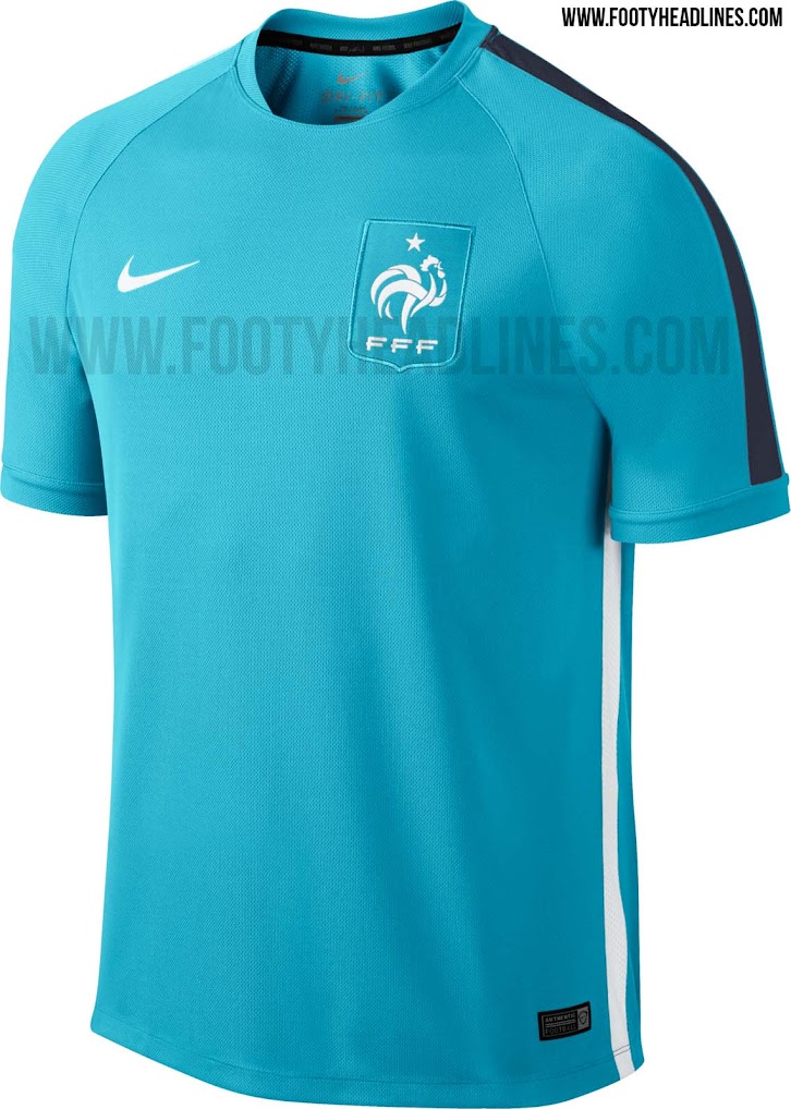 Basierend auf Nikes 14-15 Premium Trainings-Trikot Template, erhält Frankreich zwei neue Trainings-Trikots für 2015, ein türkises mit Weiß und Dunkelblau und eins in Blau, komplementiert mit türkisen und weißen Akzenten.