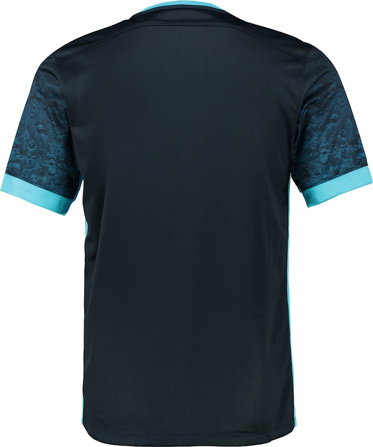 Das spektakuläre Manchester City 2015-16 Trikot ist dunkelblau mit einem unglaublichen blauen Monddesign auf den Ärmeln.