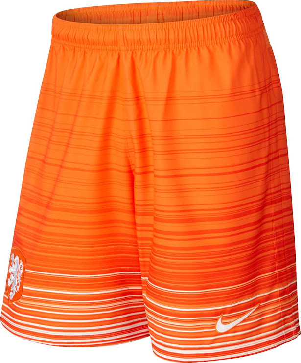 Nike kombiniert das neue Niederlande 2015 Auswärtstrikot mit auffälligen orangen Hosen und weißen Stutzen.