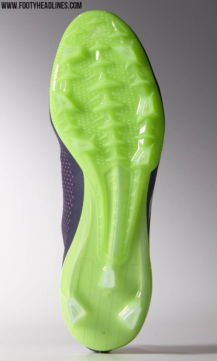 Die Sohle des neuen Adidas Primeknit 2.0 Fußballschuhs ist die selbe wie die des 2015 Adidas F50 Adizero. Die auffällige grüne Außensohle weist gerade einmal drei Stollen im Fersenbereich und eine zweite Ebene Stollen für bessere Bodenhaftung auf, inspiriert von Laufschuhen. Auf der grünen Innensohle der Adidas Primeknit 2.0 2015 Schuhe steht der große Schriftzug primeknit.