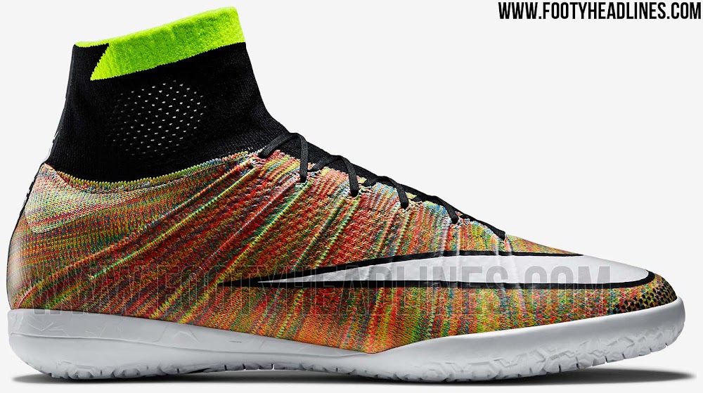 Die Nike Mercurial X Multi-Color Indoor (IC) und Turf (TF) Schuhe wurden mit einer gestrickten Oberseite und einem Dynamic Fit Abschluss für ein barfußähnliches Gefühl für Kleinfeldfußball entworfen, Teil der Nike Football X Kollektion.