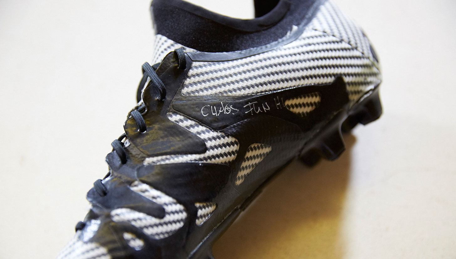 Der zweite Adidas X 15.1 Prototyp Fußballschuh weist den Schriftzug "Chaos Fun Hi" auf dem externen Cage auf. Adidas Chaos High war der Name während der Entwicklung der Adidas X 15.1 Schuhe, während die anderen Adidas X Versionen die Namen Adidas Chaos Mid (Adidas X 15.2) und Adidas Chaos Low (Adidas X 15.3) hatten.