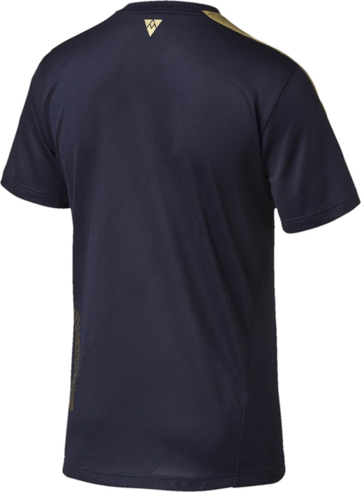 Basierend auf dem selben Template, hat das dunkelblaue Arsenal 2015-16 Trainings-Trikot goldene Applikationen in Form von Linien auf beiden Ärmeln und einem Rechteck in der oberen rechten Ecke. Das Fly Emirates Logo ist in Weiß zentral auf dem Puma Arsenal 15-16 Trainings-Trikot platziert.