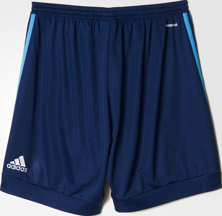 Dunkelblaue Hosen mit hellblauen Streifen und hellblaue Stutzen komplettieren das neue Adidas FC Bayern München Torwart-Trikot.