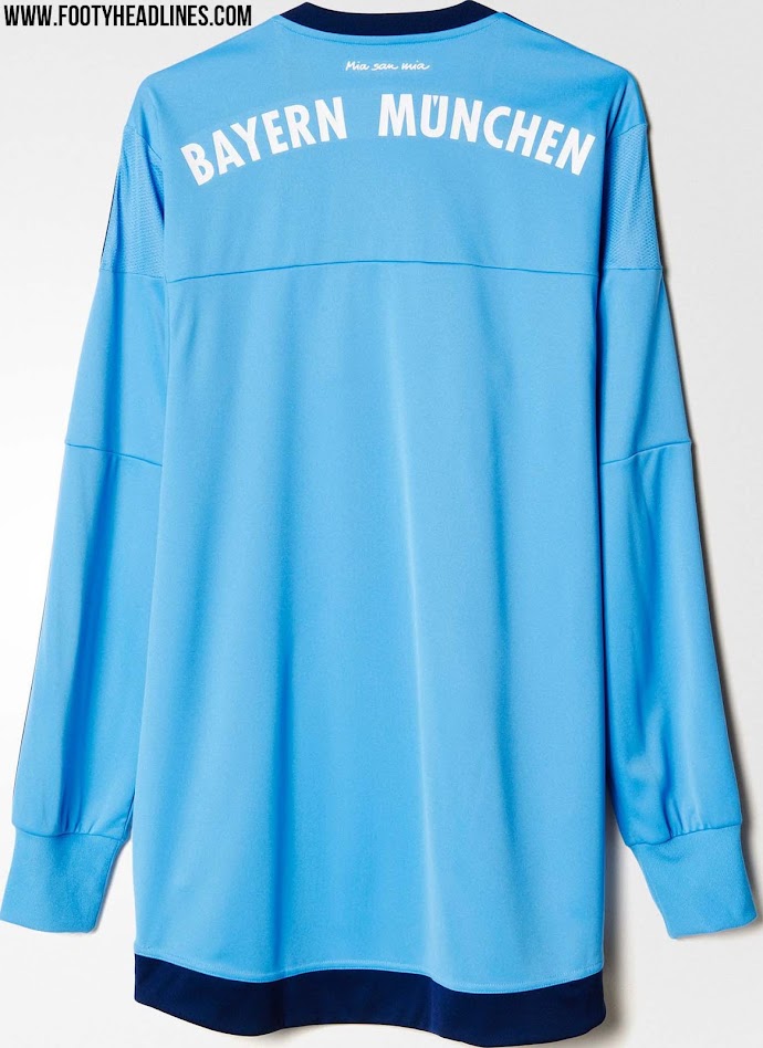 Basierend auf dem neuen Adidas 2015-16 Torwart-Trikot, kombiniert das neue Bayern München Torwart-Heimtrikot die Hauptfarbe Lucky Blue mit dunkelblauen Applikationen. Der speziell entworfene V-Kragen weist dunkelblaue Details auf, während das Adidas Logo und das Telekom Sponsorenlogo auf der Vorderseite weiß sind.