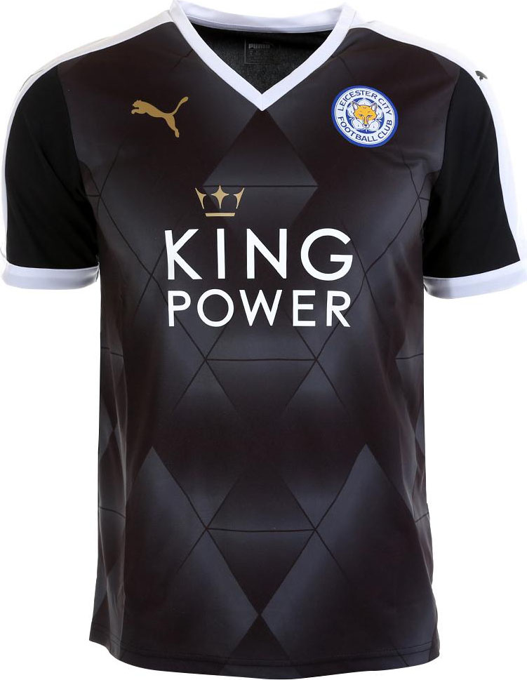 Das schwarze Leicester City 15-16 Auswärts-Trikot kommt mit einem diamantförmigen Grafikmuster auf der Vorderseite, basierend auf dem auffälligen Puma Swerve 15-16 Teamwear-Trikot.
