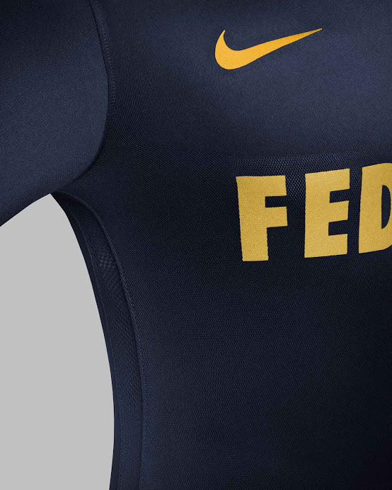 Um das dunkelblau / goldene Design abzurunden, hat das neue Monaco 15-16 Trikot ein einfarbiges dunkelblau / goldenes Vereinswappen und einen goldenen Swoosh.