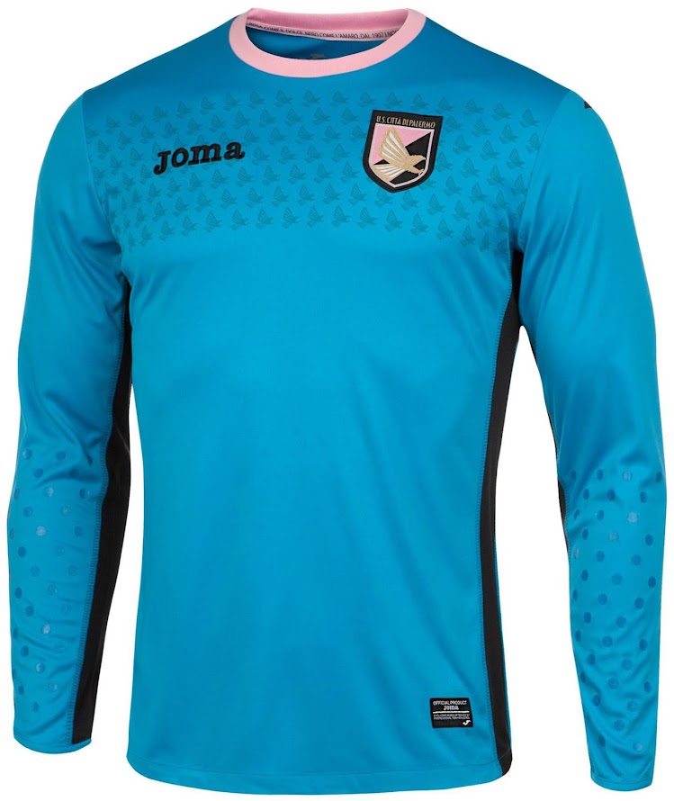 Das blaue Palermo 2015-2016 Torwart-Trikot hat ein einzigartiges Design mit Adlern im Brustbereich, kombiniert mit schwarzen und pinken Applikationen.