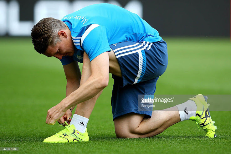 Zuvor lief Bastian Schweinsteiger für einige Monate in den Adidas F50 Adizero 2014 Fußballschuhen auf, während er nicht die 2015 Adidas F50 Adizero Schuhe trug. Es sieht nun danach aus, dass Schweinsteiger eine speziell für ihn hergestellte Version der neuen Adidas X 15 Leder-Fußballschuhe tragen wird.
