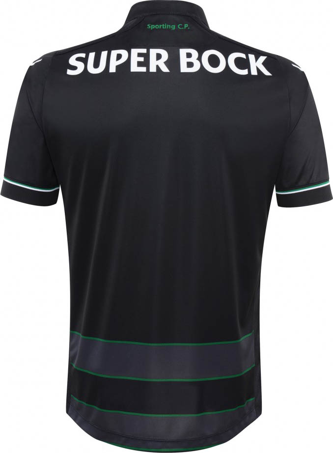Das Sporting 2015-2016 Auswärts-Trikot ist schwarz mit dunkelgrauen Querstreifen, inspiriert von den klassischen Sporting Heimtrikots mit Querstreifen. Horizontale grüne Nadelstreifen, sowie eine grüne Linie auf jeder Seite sind auf dem neuen Sporting 15-16 Trikot sichtbar.