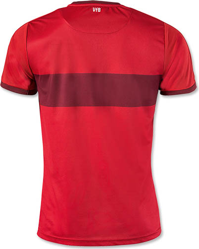 Eine schmale rote Linie innerhalb des V-Kragens des neuen VfB Stuttgart 15-16 Trikots wurde von dem Brustring inspiriert, während das traditionelle Vereinswappen weiterhin verwendet wird, nachdem es 2014 wiedereingesetzt wurde.