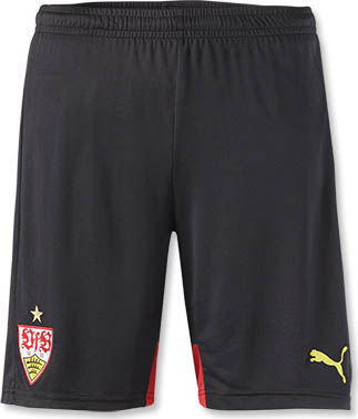 Die Stuttgart 15-16 Trikot-Hose ist schwarz mit einem gelben Puma Logo und einem roten Einsatz, während die Stutzen ebenfalls schwarz mit einem roten Streifen sind.