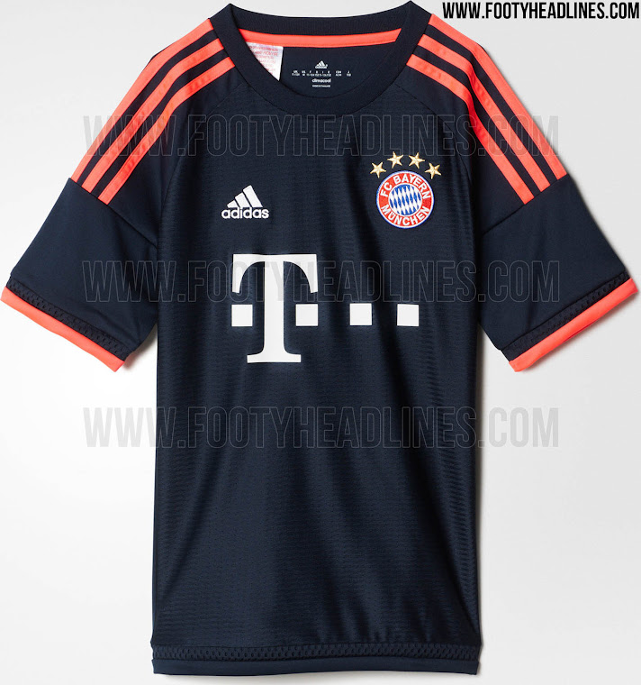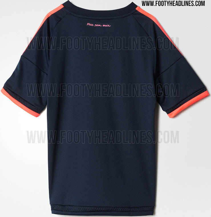 Das neue Bayern München 2015-16 Champions League Trikot kombiniert die dezente Farbe Dunkelblau mit auffälligen rötlich pinken drei Streifen auf den Ärmeln. Die Ärmelenden von Bayerns neuem Ausweich-Trikot sind ebenfalls 'Flash Red'.