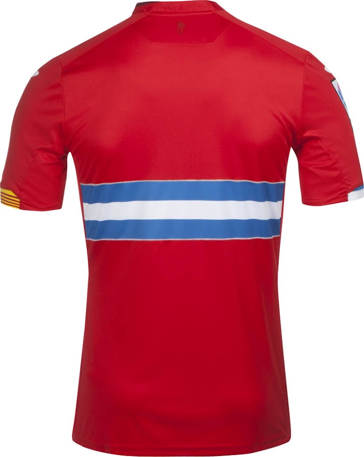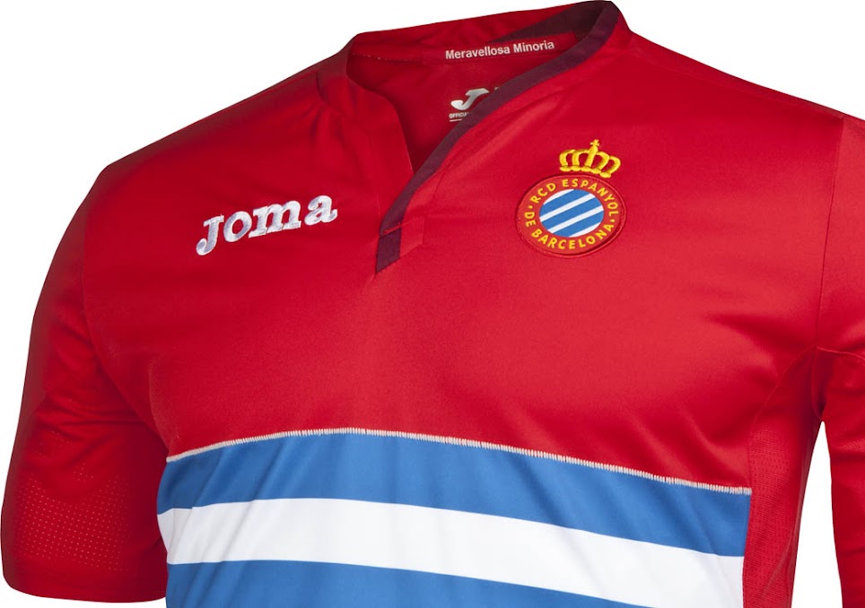 Das neue Espanyol 2015-16 Trikot, das hauptsächlich rot ist, kommt mit auffälligen Querstreifen auf der Vorderseite, die die blauen und weißen Farben des Klubs ehren. Ein dunklerer Rotton wird für Teile des asymmetrischen Kragens verwendet, während die Farben der katalanischen Flagge auf den linken Ärmelenden vorhanden sind.