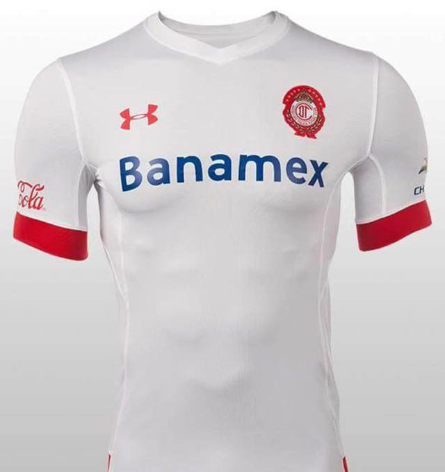 Under Armour stellt erneut die neuen Deportivo Toluca 15-16 Trikots her, die von Banamex auf der Vorderseite gesponsert werden, während die Chevrolet und Coca-Cola Logos auf den Ärmeln sichtbar sind.