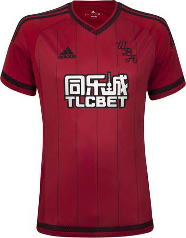 West Bromwichs neues 15-16 Heim-Trikot kehrt zu den traditionellen blauen und weißen Streifen zurück, während das West Bromwich 15-16 Auswärts-Trikot rot ist und mit dem klassischen in Schönschrift geschriebenen WBA Logo kommt.