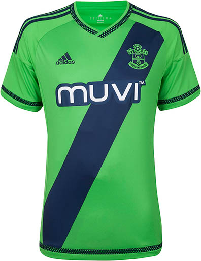 Für die Rückkehr der Saints zu Adidas dreht sich das Southampton 15-16 Heim-Trikot vollkommen um die Streifen. Während das neue Heimtrikot breitere Streifen als üblich hat, ist das Southampton 2015-16 Auswärts-Trikot grün mit einer dunkelblauen Schärpe.