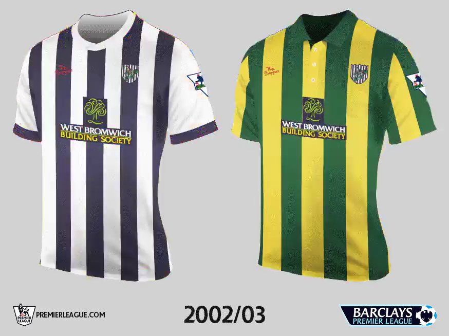 Die West Bromwich 2002-03 Trikots, die von der italienischen Marke Diadora hergestellt wurden, wiesen gestreifte Looks mit dem Spitznamen The Baggies auf der linken Brust auf.