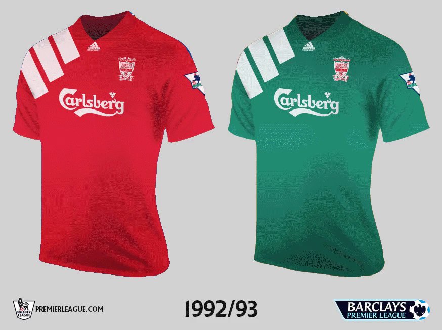 Die Liverpool 92-93 Trikots, deren Aussehen wirklich einzigartig war, waren rot und grün mit gigantischen drei Streifen auf der rechten Schulter und dem rechten Ärmel.