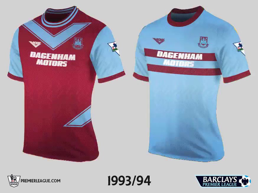 Die West Ham 93-94 Trikots, die von PONY (Product of New York) hergestellt wurden, wiesen nicht nur große, von Sponsoren inspirierte Designelemente, sondern auch ein einfarbiges Vereinswappen auf. Das West Ham Auswärtstrikot der selben Saison ist klassisch, und wurde später mit einer Neuauflage von Macron geehrt.