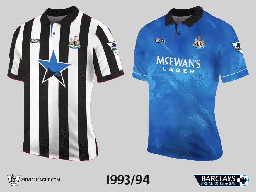 Newcastle United stieg für die Saison 1993-94 in die Premier League auf, und trug in ihrer ersten Saison in der Liga Asics Trikots. Das Newcastle 1993-94 Heim-Trikot war ziemlich traditionell, während das Auswärtstrikot blau mit einem schwarzen Polokragen und einem Grafikdruck war.