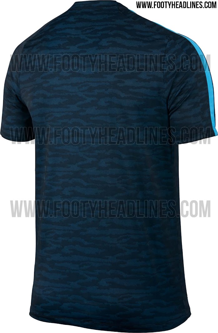 Das neue Barcelona 15-16 Champions League Trainings-Trikot, das dem Farbschema des Aufwärmtrikots folgt, ist ebenfalls dunkelblau mit einem türkisen Swoosh und einem einfarbigen Vereinswappen, das die Brust ziert.