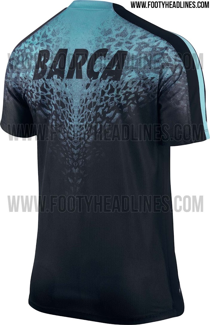 Ein türkiser Streifen verläuft auf jedem Ärmel des neuen Barça 2015-2016 Champions League Trainings-Trikots, das auch einen einzigartigen gänzlichen Druck aufweist.