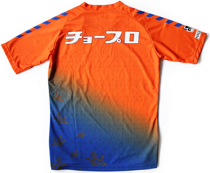 Ein gefalteter Papierkranich für das Beten für den Frieden ist auf die Vorder- und Rückseite des V-Varen Nagasaki Trikots gedruckt worden.