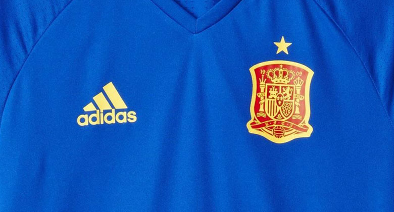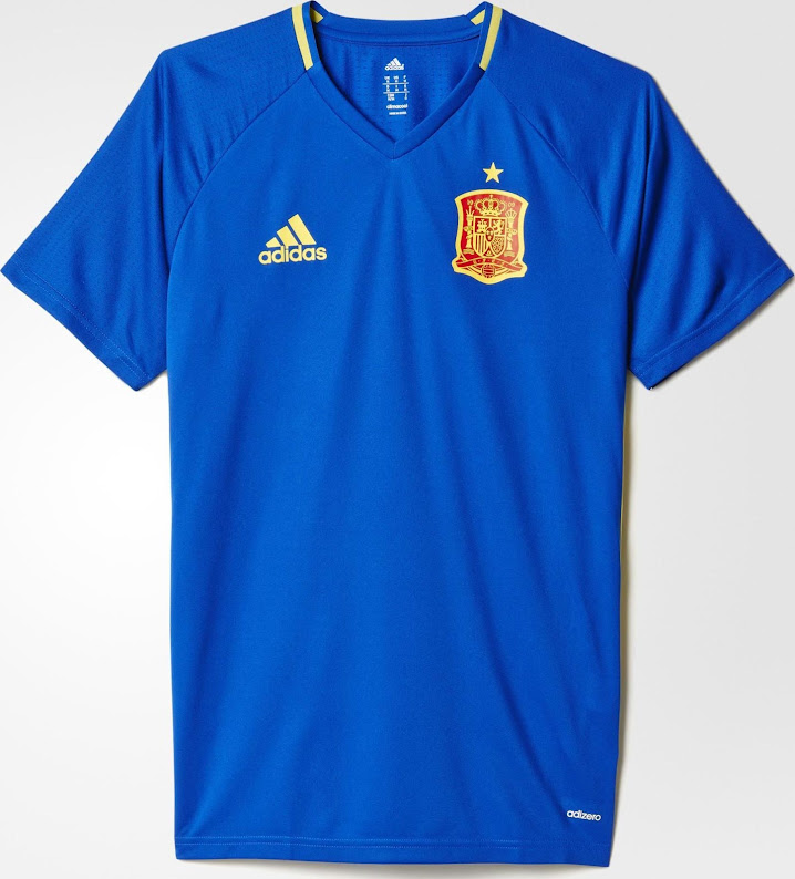 Adidas produziert die neuen Spanien EM 2016 Trikots, die zu königsblauen Hosen und schwarzen Stutzen zurückkehren, die zuletzt 1994 getragen wurden, und weist auch Adidas neue Platzierung der drei Streifen an den Seiten des Trikots auf.