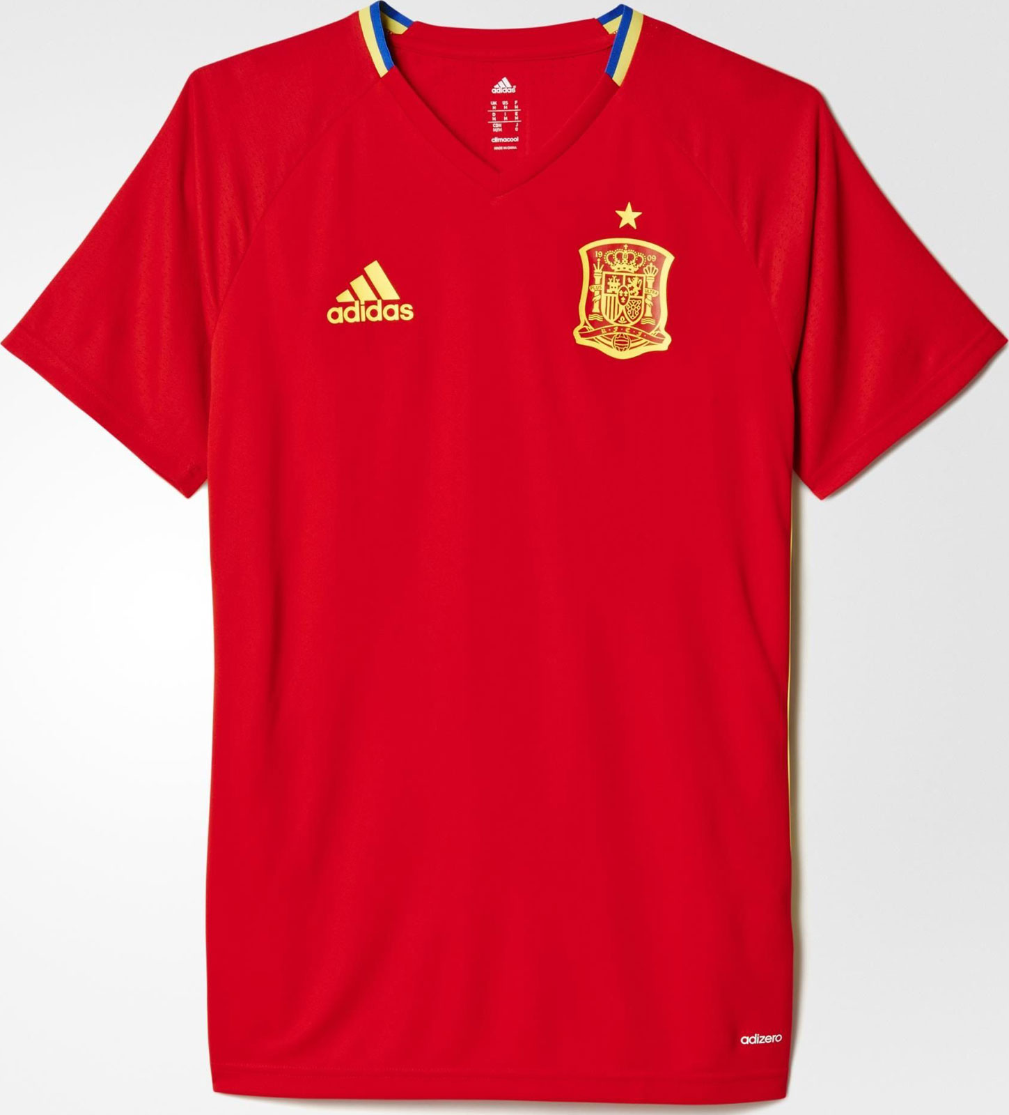 Das Adidas Spanien EM 2016 Trainings-Trikot basiert auf der leichtgewichtigen Adizero Technologie, mit hinzugefügten Belüftungslöchern im Material der Ärmel und der Rückseite.