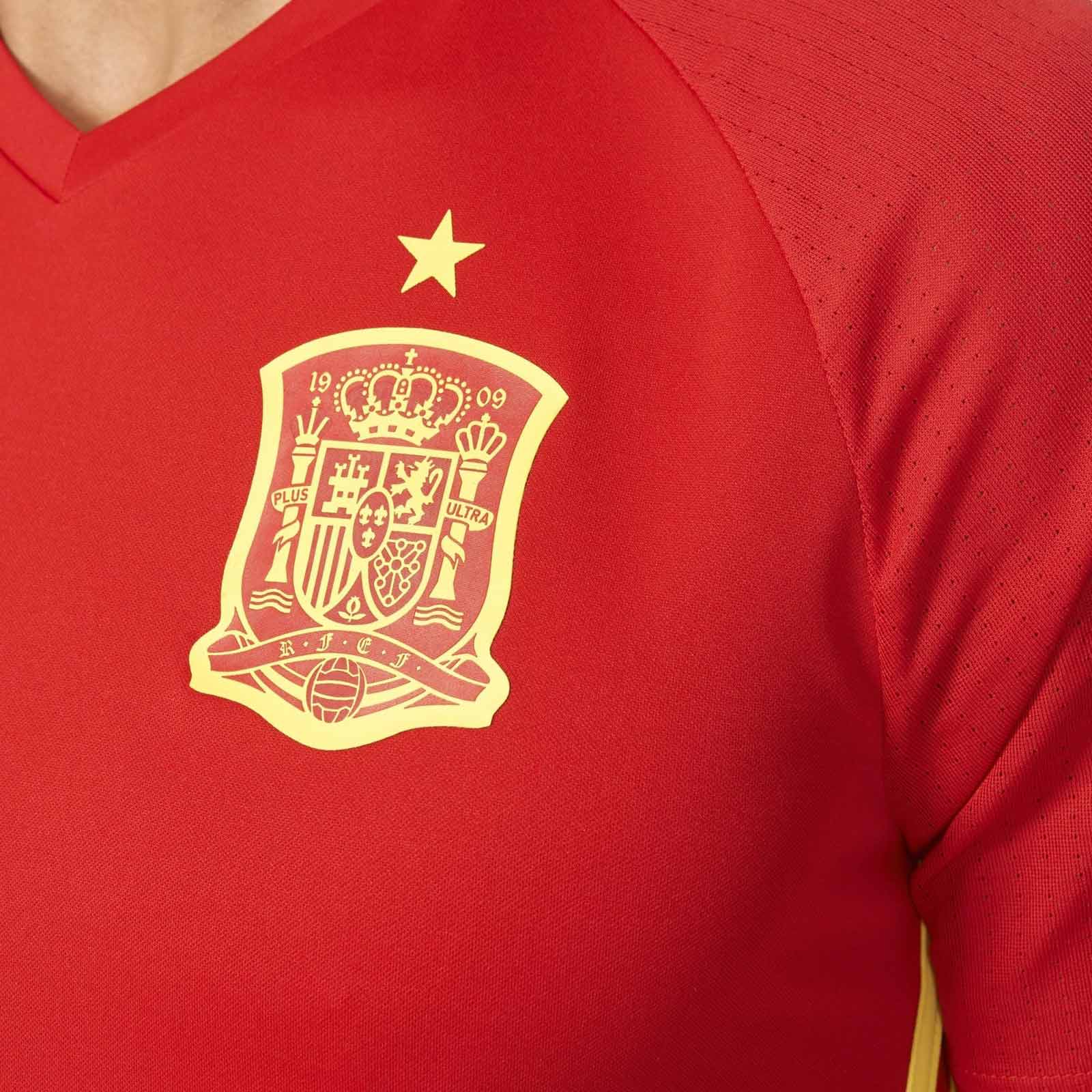 Das neue Spanien Trainings-Trikot hat eine hellere rote Grundfarbe als in vorherigen Jahren, kombiniert mit auffälligen gelben Details wie den drei Streifen, dem Adidas Performance Logo und dem Wappen der spanischen Nationalmannschaft auf der Brust.
